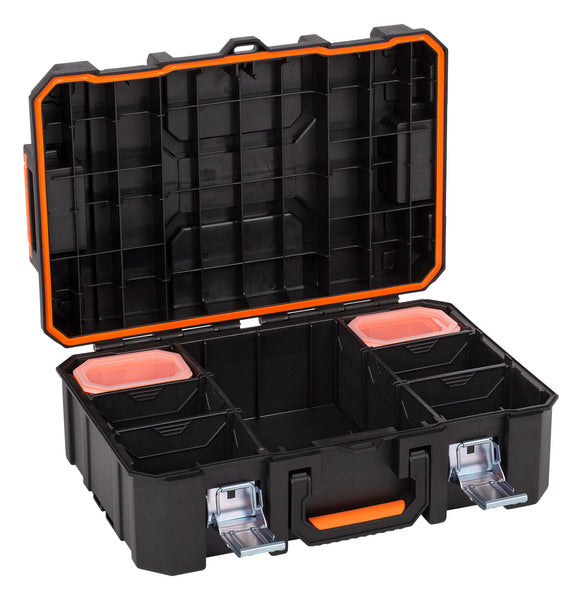 ארגז הכלים החזק הזה אידיאלי לקחת את כלי העבודה הכפולים, המטענים והסוללה למקום העבודה שלך או כדי לאחסן אותם. הקופסה ניתנת לערמה, כך שתוכל לשלב בקלות יותר מארזים או את הגרסה הגדולה יותר POWDPTB02. הידיות המובנות בחזית ובצדדים מציעות טיפול מעולה בקופסה. קליפס המתכת נועלים אותו בבטחה.