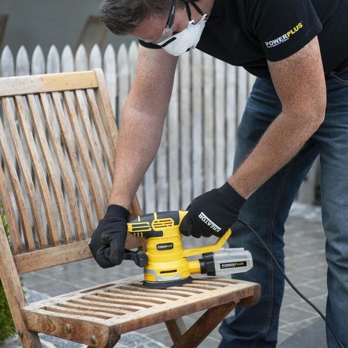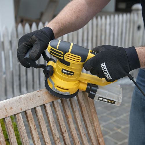 המלטשת האקצנטרית מתאימה לפרויקטי שיוף קטנים בבית. משטח השיוף המסתובב בקוטר 125 מ"מ מאפשר לשייף ביעילות גם משטחים שטוחים וגם קמורים – אידאלי לעבודה על רהיטים בעלי קימורים.