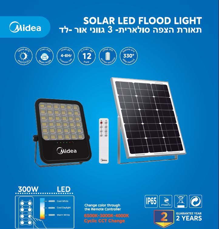 פנס הצפה סולארי מבית מידאה מקצועי 300W גוף שחור אור קר